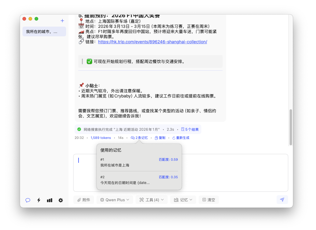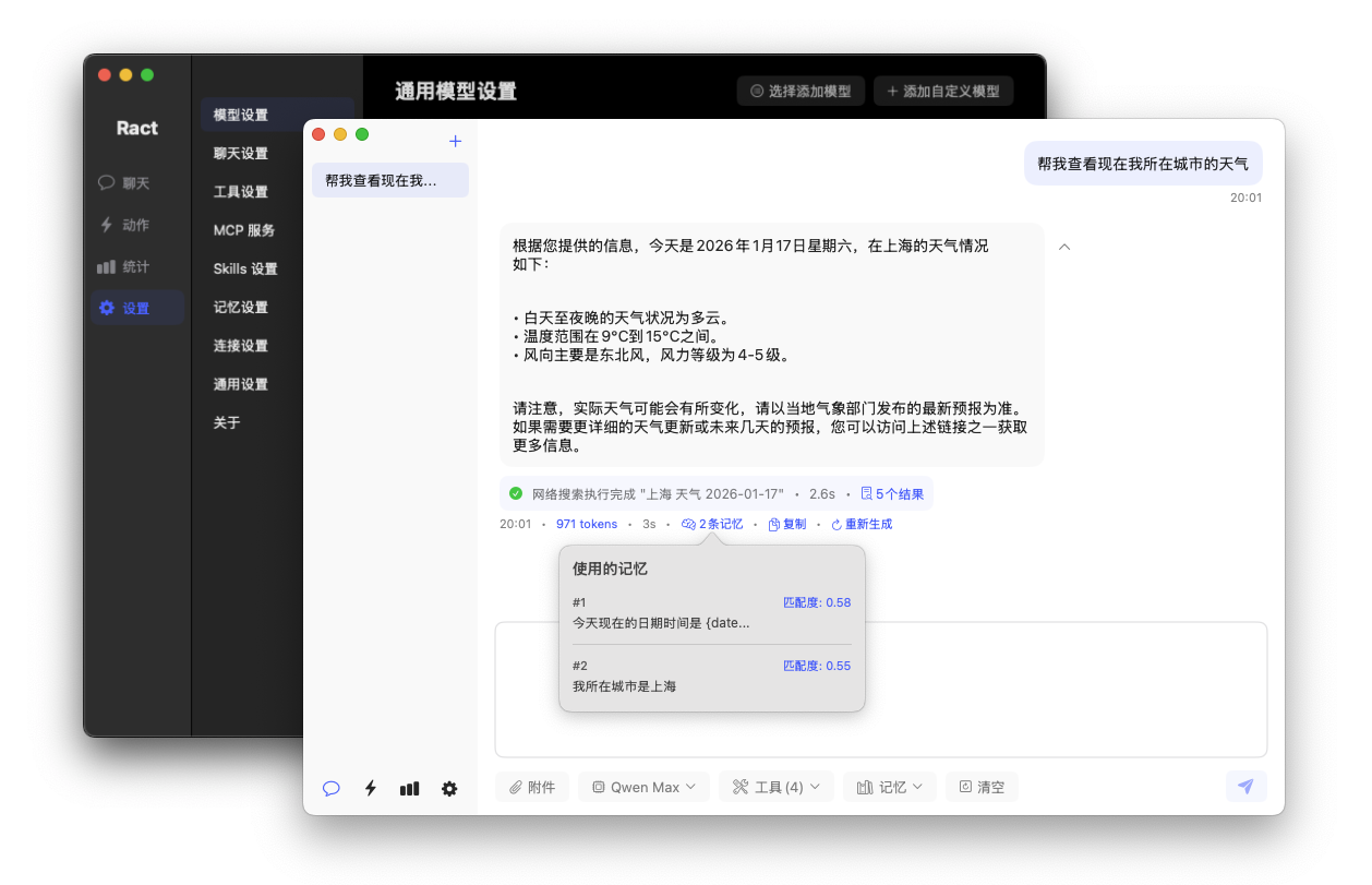 During conversations, Ract automatically selects and retrieves global memories and items from your memory bank, associating the most relevant memories with your questions so the AI becomes a personal assistant that understands you. 在对话过程中 Ract 会自动选择和检索全局记忆和记忆库,为你的问题关联最匹配的记忆,让 AI 成为懂你的私人助手。