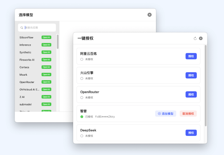 Connect to multiple AI model providers. Seamlessly add and switch between models for multi-turn conversations. Choose the best-suited model for each task to get the optimal response. 支持连接多种 AI 模型提供商。无缝添加和切换不同模型进行多轮对话。为每个任务选择最合适的模型,获得最佳响应。
