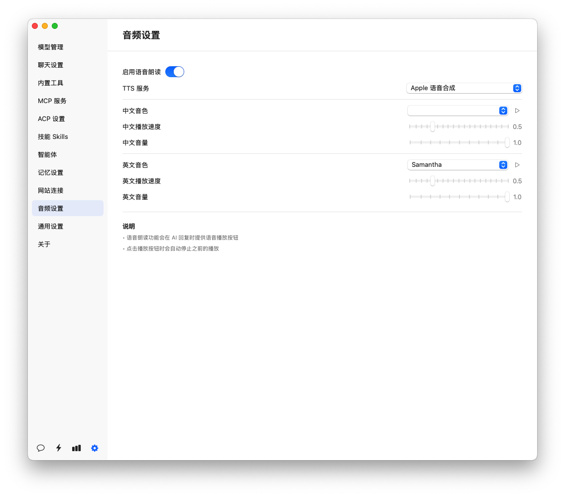 将 AI 生成的文本内容转换为语音进行播放,支持多种声音和语言选择。