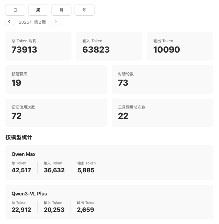 View comprehensive statistics by day, week, month, and year. Track model consumption, conversation rounds, and tool calls to understand your AI interaction patterns. 按日、周、月、年维度查看全面统计。跟踪模型消耗量、聊天轮数和工具调用量。深入了解你的 AI 交互模式。
