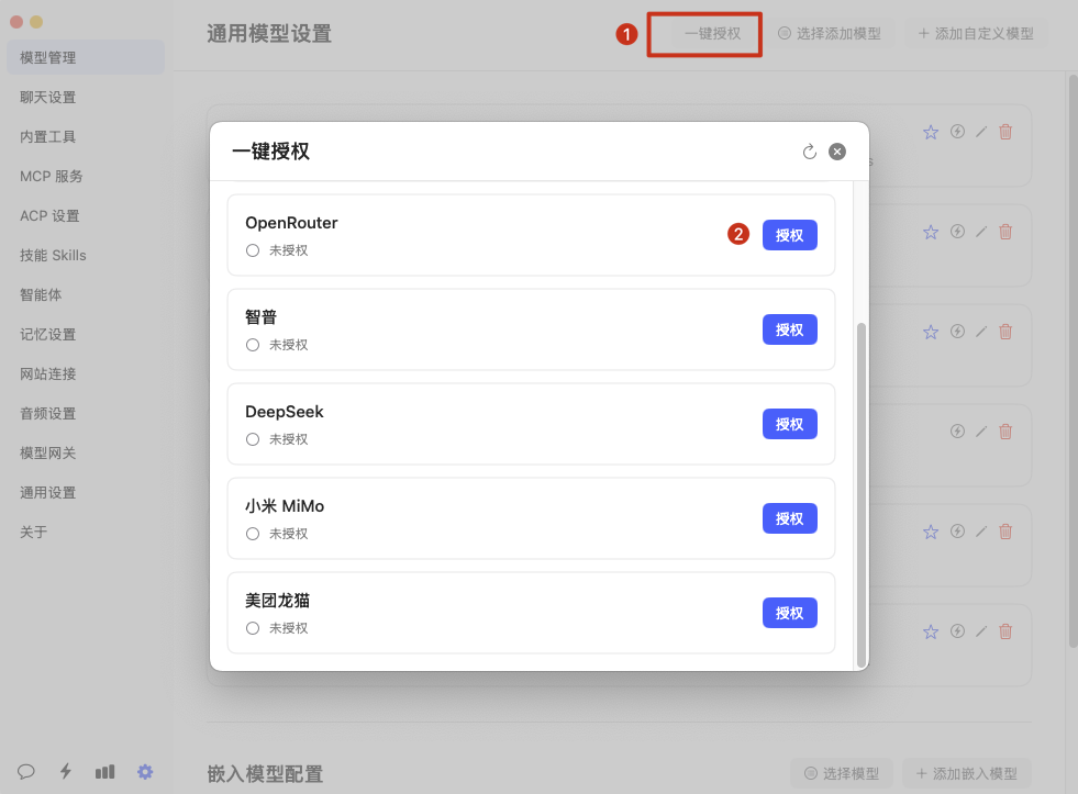 后续通过一键授权添加模型,则无需再输入 API Key,会自动填入。